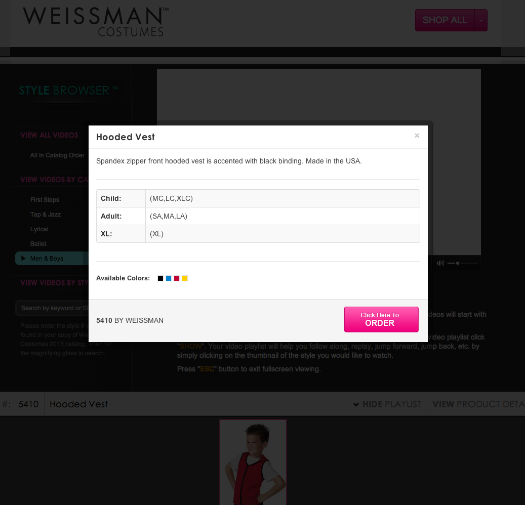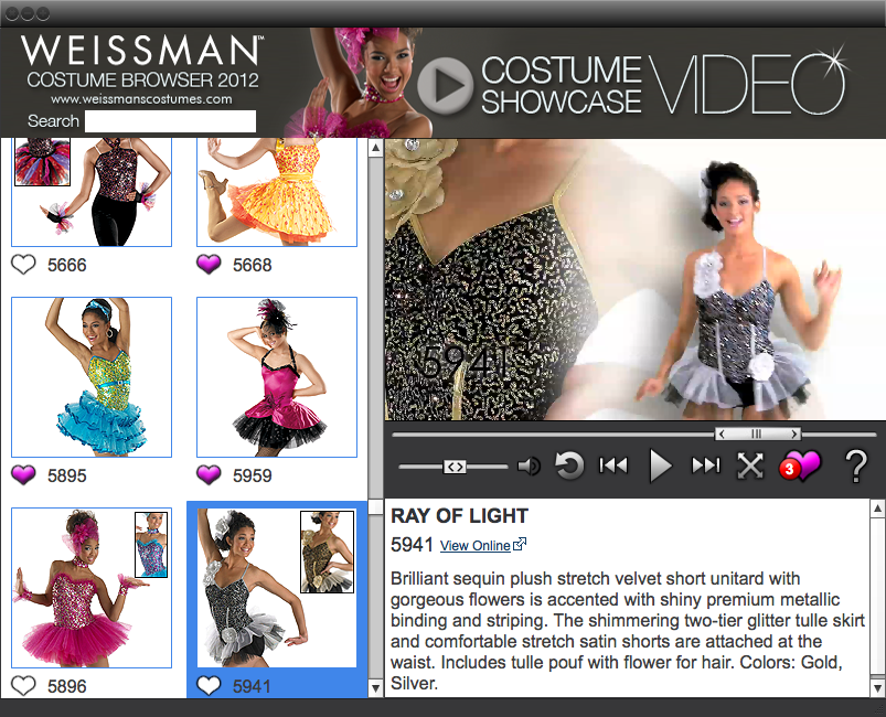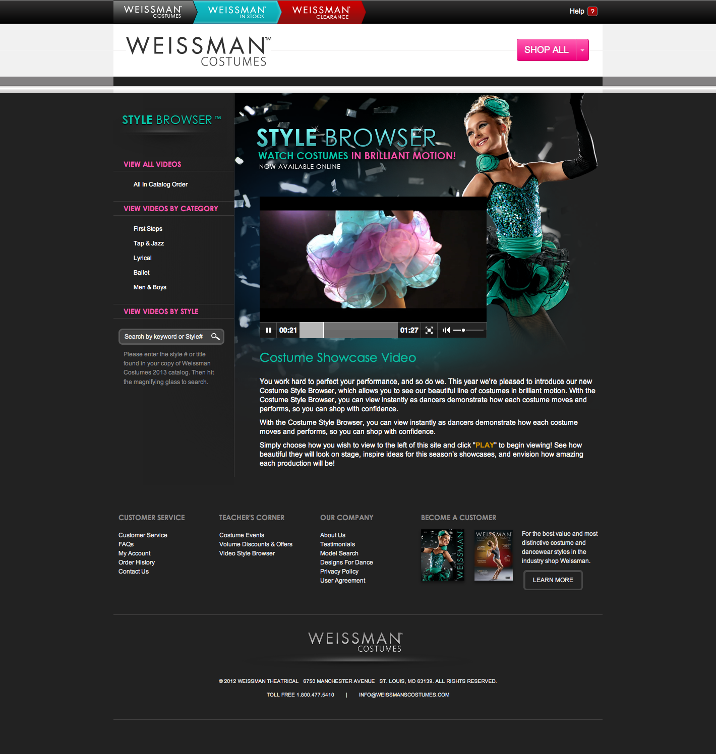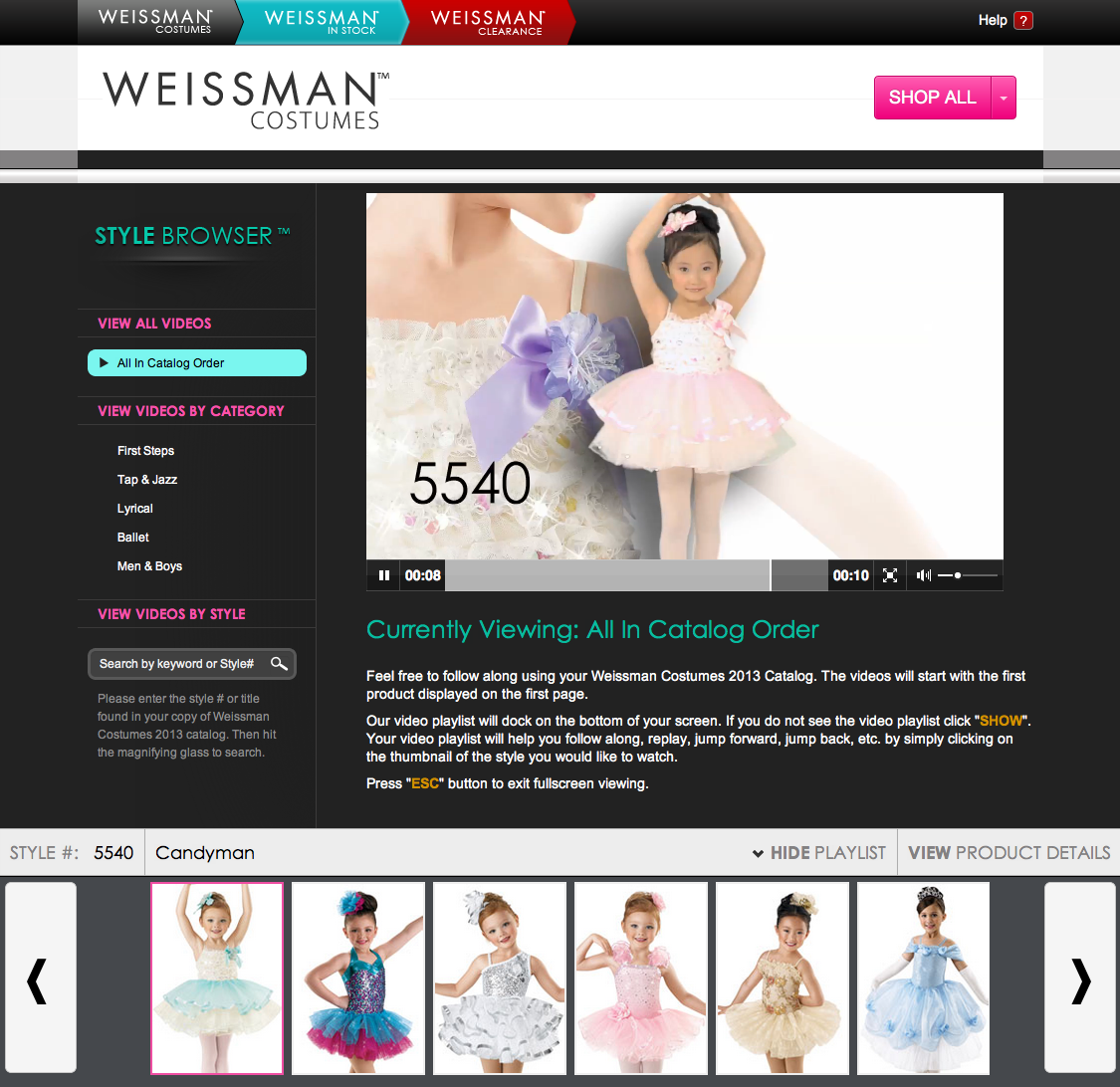 The centerpiece of the 2012 Style Browser is the integrated video player that shows dancers performing in the costumes. Users can browse videos by category (Ballet, Tap & Jazz, Lyrical, etc.) or search by specific style numbers.