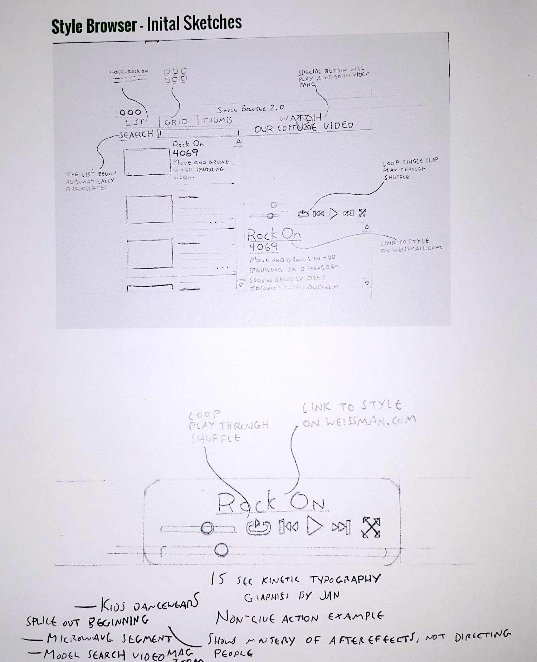 I began with hand-drawn sketches to rapidly explore different concepts for integrating video with the catalog browsing experience. These initial explorations focused on how users would navigate between video content and static product information, including ideas for "loop play through shuffle" and synchronized video segments.